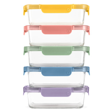 Includes (5) 3.4 cup glass food containers and five BPA-free plastic locking lids to keep food fresh for longer.