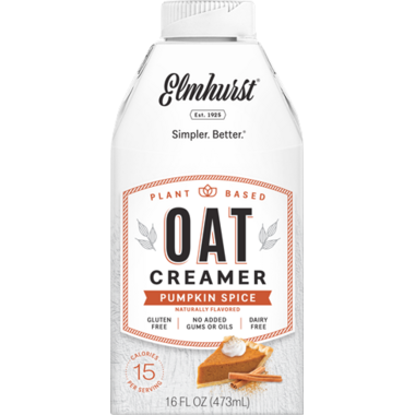 Elmhurst Pumpkin Spice Oat Creamer is plant based and naturally flavored.