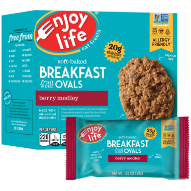 Enjoy Life introduces soft baked fruit and oat breakfast ovals made with all natural ingredients. Four types of purity protocol gluten free oats baked to perfection with real cranberries, raspberries, and blueberries.
