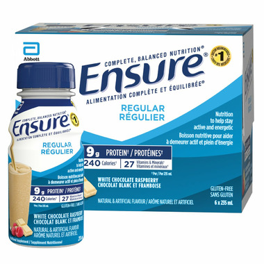 6 x 237-mL Bottles Ensure Regular White Chocolate Raspberry is complete, balanced nutrition. It can be used as a supplement between or with meals.