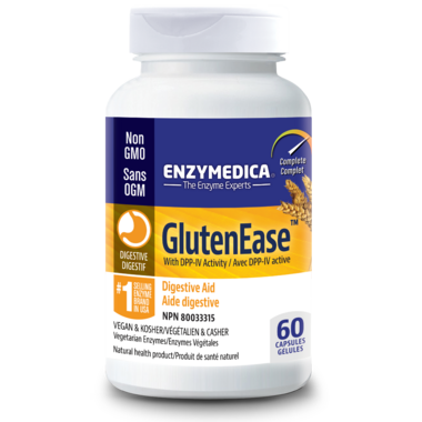 Enzymedica GlutenEase contains Protease Thera-blend (G1) along with DPP-IV activity for enhanced digestion of foods containing gluten and casein. Starch-digesting amylase enzymes assist in the digestion of the carbohydrate portion of grains, such as wheat, which contain gluten.