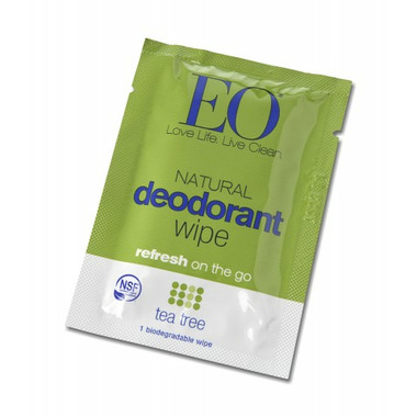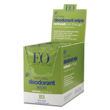 These Natural Deodorant Wipes are effective and gentle on skin. Organic Tea Tree, Lavender, Vetiver, Cedarwood, Ylang Ylang, and Rosemary essential oils are combined with Organic Ethanol to kill bacteria, eliminating body odor at its source. Organic Glycerin keeps skin moisturized and happy. They contain no aluminum salts, propylene glycol, or zinc salts that can clog pores and toxify the system. Convenient, individually wrapped wipes make it easy to stay fresh on the go!
