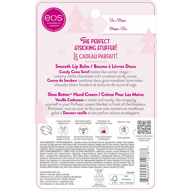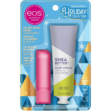 The dreamiest holiday moments! eos Limited Edition Holiday Collection contains Candy Cane Swirl Lip Balm which feels like winter magic -- melted white chocolate + crumbly crushed candy canes and Vanilla Cashmere Hand Cream is sweet and nuzzly, like wrapping yourself in your fluffiest, coziest blanket in front of the fireplace.