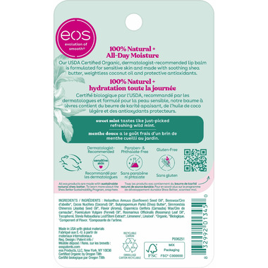 eos Organic Stick Lip Balm Sweet Mint is 95% organic, 100% natural, and paraben and petrolatum free. Packed with antioxidant-rich vitamin E, soothing shea butter and jojoba oil, eos Organic hydrates your lips and enhances your natural beauty.