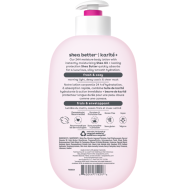 eos 24H moisture body lotion with instantly moisturizing Shea Oil + lasting protection Shea Butter quickly absorbs for a luxurious, silky-smooth hydration. Morning light, dewy cassis & sheer musk.