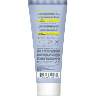eos 24H moisture body lotion with instantly moisturizing Shea Oil + lasting protection Shea Butter quickly absorbs for a luxurious, silky-smooth hydration. Whipped Vanilla, soft musk & cozy caramel.
