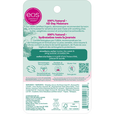 eos lip balm in Strawberry Sorbet is 95% organic, 100% natural, and paraben and petrolatum free. Packed with antioxidant-rich vitamin E, soothing shea butter and jojoba oil, eos keeps your lips moist, soft and sensationally smooth.