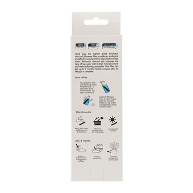 Using only the highest grade Binchotan charcoal, this water filter provides an ecological and effective way to remove impurities from your tap water. Binchotan charcoal also improves the taste of tap water with its high mineral content and water-softening properties. Binchotan charcoal naturally absorbs toxins from tap water and imparts good minerals such as calcium, potassium, magnesium and phosphates to water. One filter can last up to 6 months. Simply toss it in the compost after its lifecycle is complete.