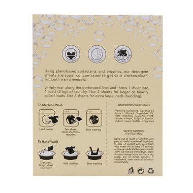 These eco-friendly, plant-based laundry sheet contains ultra-concentrated effective cleaning power, packed into a tiny, pre-measured sheet of detergent! Simply toss in your laundry and wash. The strong cleaning formula uses plant enzymes to trap and and dislodge dirt from clothing. Works in all types of washing machines, including high-efficiency (HE). Packaging is entirely plastic-free, each box provides up to 48 loads. It is also free of starch, chemicals, dyes, parabens, and phosphatessuitable for intimates and baby clothing. Clean, green, cost-effective and convenient.