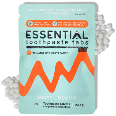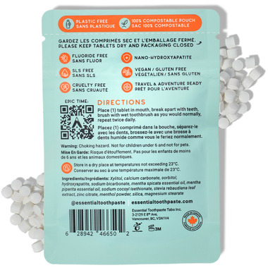 Essential Toothpaste Tabs are proudly formulated and made in Canada with clean ingredients, backed by science. Each tab contains 10% nano-hydroxyapatite (a NASA-developed fluoride alternative proven to remineralize enamel), 35% xylitol to help fight cavity-causing bacteria, and gentle, coconut-derived foaming agents instead of harsh SLS. With a low-abrasion RDA of 50.34, they're safe for sensitive teeth, and the refreshing blend of peppermint, spearmint, and menthol leaves your mouth feeling crisp and clean. Plus, every pouch is 100% plastic-free, home-compostable, and travel-ready - lightweight, portable, and liquid-free for life on the go.