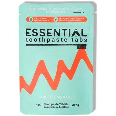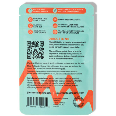 Essential Toothpaste Tabs are proudly formulated and made in Canada with clean ingredients, backed by science. Each tab contains 10% nano-hydroxyapatite (a NASA-developed fluoride alternative proven to remineralize enamel), 35% xylitol to help fight cavity-causing bacteria, and gentle, coconut-derived foaming agents instead of harsh SLS. With a low-abrasion RDA of 50.34, they're safe for sensitive teeth, and the refreshing blend of peppermint, spearmint, and menthol leaves your mouth feeling crisp and clean. Plus, every pouch is 100% plastic-free, home-compostable, and travel-ready - lightweight, portable, and liquid-free for life on the go.