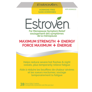 Estroven Maximum Strength + Energy is a natural health product that includes effective ingredients for multi-symptom menopause relief. Made with a unique triple-action formula that contains naturally-sourced Black Cohosh and clinically proven Soy Isoflavones, for maximum relief of severe and frequent hot flashes and night sweats, plus to reduce irritability associated with menopause. Other ingredient extracts to help temporarily relieve fatigue and promote alertness.