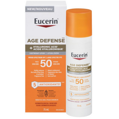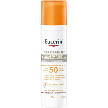 - Daily Face Sunscreen for Aging Skin: Eucerin SPF 50 Age Defense is a lightweight sunscreen that is formulated with SPF 50 and hyaluronic acid to visibly reduce the appearance of fine lines and wrinkles* (in 1 week, with continuous use