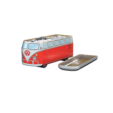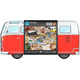 A collectible collage style puzzle celebrating the history of volkswagen bus. 550 pieces Puzzle stored inside VW bus shaped tin packaging. Licensed exclusive item.