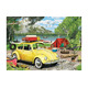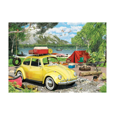 Relieve the nostalgia of outdoor adventures with the VW Beetle Camping Tin 550-piece puzzle by Eurographics! This vibrant artwork captures a classic yellow VW Beetle parked by a serene lakeside camping spot, surrounded by nature and fun outdoor essentials.