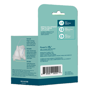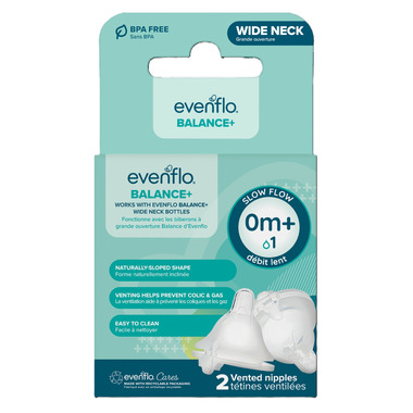 Developed with Pediatric Feeding Specialists, the Evenflo Feeding Balance+ Wide Neck Nipple is designed to support healthy bottle feeding without interfering with your breastfeeding journey. The unique, naturally-sloped nipple promotes a healthy wide latch for your baby by providing a proper resting place for their lips, helping to decrease mouth fatigue. The effective 1-piece integrated vent helps prevent colic, gas, and fussiness with no extra parts to clean or lose. The slower flow rate helps prevent chugging, allowing for a calm, gulp-free feeding at baby's pace. The Balance+ Wide Neck Nipple is compatible with the Balance+ Wide Neck Bottle. Evenflo Feeding nipples are 100% free of BPA, polycarbonates, PVC and phthalates, and are also made of FDA-approved food grade material.