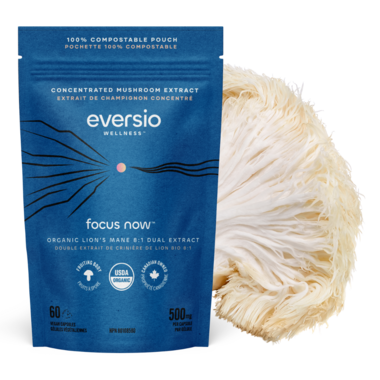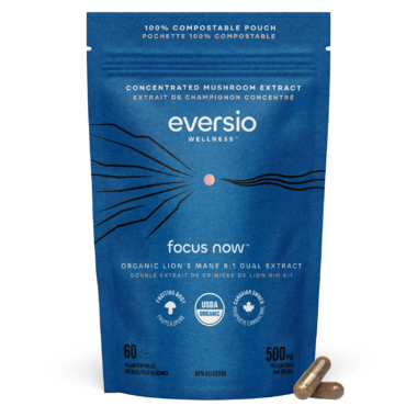 Eversio’s FOCUS NOW Lion's Mane capsules are made from an 8:1 dual extract of organic, wood-grown medicinal mushrooms. Lion’s mane benefits the brain in many ways and supports improved concentration, memory, productivity, and mental clarity. Goodbye brain fog! Dual extracted lion’s mane mushrooms are also known to improve gut health and protect your stomach from the development of ulcers. Take one capsule daily for maintenance of brain and gut health, or up to three capsules daily as a maximum therapeutic dose (12000mg according to Health Canada) to address a specific brain, nerve, or digestive condition.