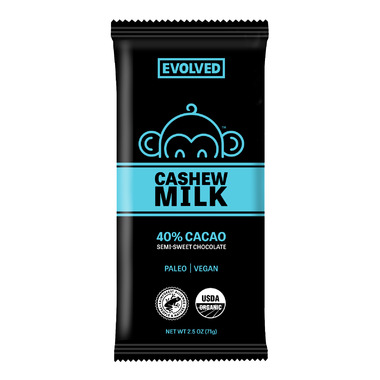 Chocolate: It’s food, not candy. Evolved Cashew Milk Chocolate made with 40% cacao semi sweet chocolate.