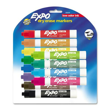 Dry-erase marker delivers a specially formulated low-odor ink with a chisel point that is perfect for classrooms, small offices and homes. Consistent colour quality for bold colours and great erasability. Colours of markers include aqua, black, blue, brown, green, lime, orange, pink, purple, red, turquoise and yellow. Certified AP nontoxic.