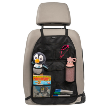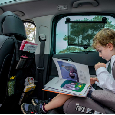EZI Travel Plus is a large capacity seat organizer for cars. Have a perfect organization in your car. Each item will find its place in the different pockets of your organizer. Give your child the opportunity to have everything they need for the trip at their fingertips . All the compartments will allow you to store your child's toys, water bottles, books etc... Easy to install , EZI Travel Plus sets up in seconds, thanks to its extra-long and adjustable high and low straps, you can modulate the organizer according to your seat. This seat organizer is made from 92% recycled plastic, it is designed to last over time and withstand any test.