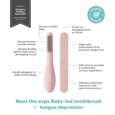 The Dual Pack includes ezpzs oral care tools, the Baby-Led Toothbrush and Sensory Tongue Depressor. ezpz Baby-Led Toothbrush. Oral health is critical for a babys growing mouth, feeding skills and speech development, and dentists recommend a toothbrushing routine before baby has their first tooth (usually between 3-6 months). Its best to allow babies to independently grab, hold and control the toothbrush making brushing less of a battle! The Baby-Led Toothbrush is a toothbrush designed for baby-led oral care, which encourages healthy oral habits and may help prepare your baby for starting solids.