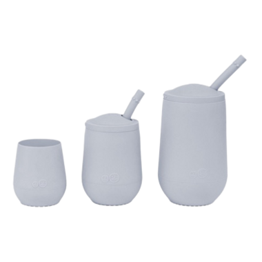 The developmental drinking system starts with the 2oz Tiny Cup (4 months +), followed by the 4oz Mini Cup + Straw (9 months +) and concludes with the 8oz Happy Cup + Straw (2 years +).