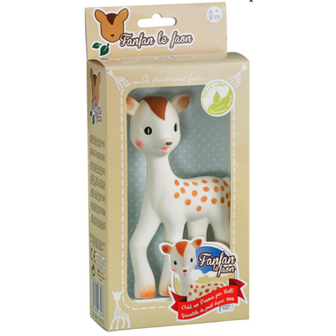 It draws baby's gaze by way of the dark, highly contrasted spots all over its body and becomes a familiar, reassuring object that is easily recognised. Featuring a whistle, Fanfan entertains baby, and develops baby's sense of hearing while helping to establish the relationship of cause to effect. Flexible with several chewable parts (ears, legs, etc.), it is perfectly suited to help soothe baby's gums when getting first teeth.