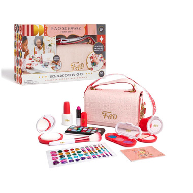 Experience the world of fashion and glamor with the F.A.O. Schwarz Glamour Go Designer Purse and Accessories Set. The set comes with a high-quality designer purse that stylishly and neatly contains all your play essentials. Explore your creative side by customizing your play smartphone with the provided gem stickers, creating a unique look that's all your own. This comprehensive 12-piece set includes a FAOdesigner purse, FAO keychain, pom keychain, play compact, play blush, play eyeshadow, play nail polish,play lipstick, makeup brush, play credit card, play smartphone, and gem stickers. Kids can enjoy the excitement of glamor and makeup without the mess, thanks to the safe, pretend makeup included. This set is perfect for children aged 3 and up, serving as a fantastic introduction to the exciting world of fashion and makeup play. Let your little one step into a world of glam with the Glamour Go Designer Purse and Accessories Set.Carry your play essentials in style with a high-quality, realistic designer purse Ignite creativity by personalizing your play smartphone with sparkling gem stickers. The 12-piece set includes a fashionable purse, pretend makeup, and glamorous accessories for hours of imaginative play. Experience the fun of glam without the mess with the safe, pretend makeup included. Suitable for children ages 3 and up who love to role-play and explore fashion