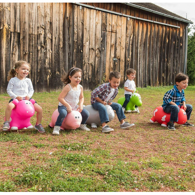 Farm Hoppers are fun, whimsical, brightly coloured, inflatable animals with soft gripable ears for children to hold onto while they bounce around. With feet touching the ground and hands holdings onto the ears, kids can bounce, scoot and walk around in a supported manner that help develop core muscle and coordination. These delightful bouncers are made from high quality BPA- free PVC and can be used both indoors and out. They come complete with their own soccer valve, needle and pump in an attractive box. The fact is that they are just plain fun and keep children highly entertained while providing and outlet for that relentless toddler energy.