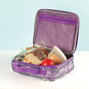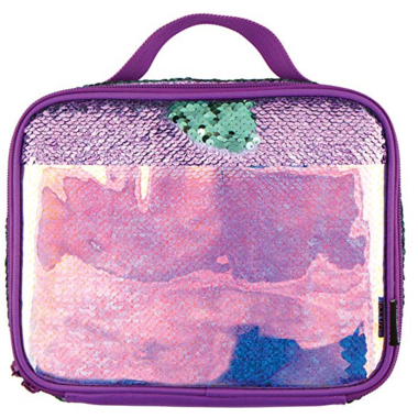 Dazzling purple holographic Magic Sequin lunch tote flips to dreamy seafoam green when swiped. Includes iridescent vinyl outside pocket. This lunch tote is insulated and features a mesh pocket to hold lunch yummies. Matching backpack available.