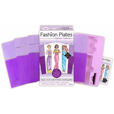 Introducing the Glamour Collection expansion set- new from Fashion Plates! Create glamorous gowns and designer dresses with 10 all-new plates! The Glamour Collection plates include ball gown, party dress, and red-carpet looks, with fashion textures built into the back of each plate. The set also includes a refill rubbing crayon, idea guide, and storage tray. Mix & match the Glamour Collection plates with your other Fashion Plates to create even more unique styles.
