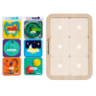 Mix and match your discovery! A modular sensory toy, PlayTab lets you build a unique experience packed with fine motor challenges, visual fascination, cause-and-effect discoveries, and more. Grab the board and then choose from the twelve unique tiles. There's a set of gears that spin together, textured buttons that squeak, colourful balls that roll through a maze, a dial that clicks from one to ten... They all magnetically snap onto the board any way you want. Or, you can just throw a few in the diaper bag, or even stick them to the fridge! The classic activity board becomes more versatile and more open-ended with PlayTab.