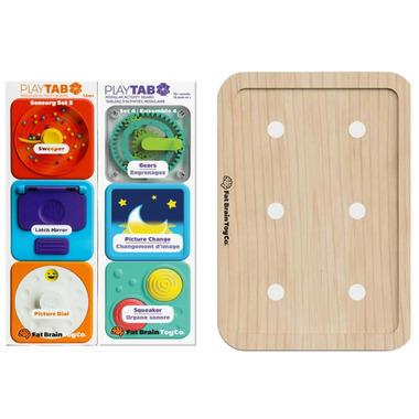 Mix and match your discovery! A modular sensory toy, PlayTab lets you build a unique experience packed with fine motor challenges, visual fascination, cause-and-effect discoveries, and more. Grab the board and then choose from the twelve unique tiles. There's a set of gears that spin together, textured buttons that squeak, colourful balls that roll through a maze, a dial that clicks from one to ten... They all magnetically snap onto the board any way you want. Or, you can just throw a few in the diaper bag, or even stick them to the fridge! The classic activity board becomes more versatile and more open-ended with PlayTab.