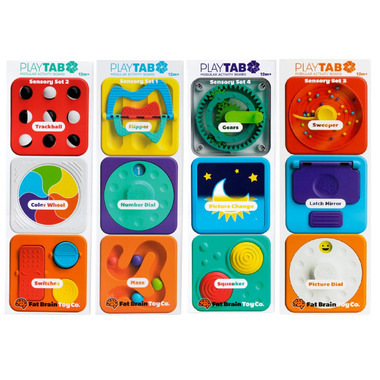Mix and match your discovery! A modular sensory toy, PlayTab lets you build a unique experience packed with fine motor challenges, visual fascination, cause-and-effect discoveries, and more. Grab the board and then choose from the twelve unique tiles. There's a set of gears that spin together, textured buttons that squeak, colourful balls that roll through a maze, a dial that clicks from one to ten... They all magnetically snap onto the board any way you want. Or, you can just throw a few in the diaper bag, or even stick them to the fridge! The classic activity board becomes more versatile and more open-ended with PlayTab.