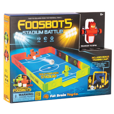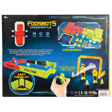 Spin, kick, WIN! Fit the parts together to build the stadium and then grab the two included Foosbots. When you squeeze your Foosbot's arms, it spins to kick the ball FAST. Can you get your ball past your opponent and score the winning goal? Complete with training gear for honing your skills on the sidelines, this stadium set is a must-have for the ultimate Foosbots tournament!