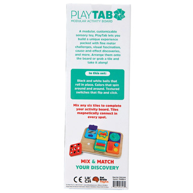 Mix and match your discovery! A modular sensory toy, PlayTab lets you build a unique experience packed with fine motor challenges, visual fascination, cause-and-effect discoveries, and more. Grab the board and then choose from the twelve unique tiles. There's a set of gears that spin together, textured buttons that squeak, colourful balls that roll through a maze, a dial that clicks from one to ten... They all magnetically snap onto the board any way you want. Or, you can just throw a few in the diaper bag, or even stick them to the fridge! The classic activity board becomes more versatile and more open-ended with PlayTab.