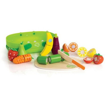 Fresh from the farmers market! Kids can carry all the wooden fruits and veggies in the bright green basket like they're shopping for the perfect ingredients. Then, they can cut each one into pieces with the wooden knife and cutting board.