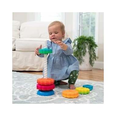 It's a stacking toy with a spin - literally! Drop the vibrant star-burst discs of the SpinAgain onto the threaded corkscrew pole and watch them spin fast and smooth to settle onto the reversible base.