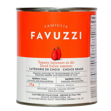 Favuzzi Diced Italian Tomatoes grown and processed in Italy.