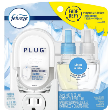 From kids' sports gear to your dog’s favorite slobbery toy, your home is full of hidden stinks. With a Febreze Fade Defy PLUG Air Freshener starter kit, you can eliminate odors with a continuous fresh scent. While other pluggable air fresheners fade quickly, the Fade Defy PLUG is true to its name, and keeps its fresh scent for a full 50 days on low.