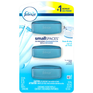 - Febreze SMALLSPACES cleans away odors and freshens for up to 30 days