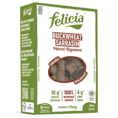 Organic Buckwheat Mezzi Rigatoni has 10g of protein, 4g of fibre and made with 100% buckwheat.