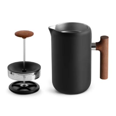 - Stainless steel body and filter - BPA-free plastic lid and handle - Non-stick PTFE-coated interior (PFOA-free) - Walnut wooden press and handle