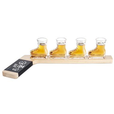 Includes: 4 skate shot glasses & solid wood hockey stick serving board with tape chalkboard