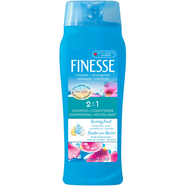 With hyaluronic acid Reviving Boost hyaluronic acid + camellia oil + keratin. Leaves hair clean, shiny & manageable. HEALTHY BEAUTIFUL HAIR Finesse features a hair reviving boost of Hyaluronic acid - ultra-hydrating, Camellia Oil - rich in Omega-9 fatty acids, vitamins, and antioxidants, and Keratin - the building block of hair. Revives hair with boost of hyaluronic acid, camellia oil & keratin