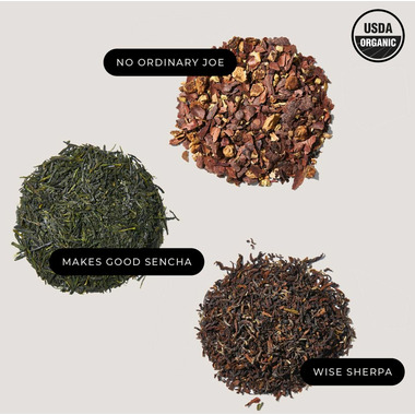 A 3 pack of teas and infusions that includes No Ordinary Joe loose leaf tea, Makes Good Sencha loose leaf tea and Wise Shepa loose leaf tea.