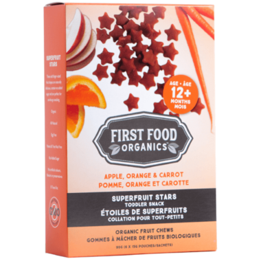 Superfruit Stars are an exciting addition to First Food Organics' toddler snacks line. These organic fruit chews are made with fruit and vegetable purees and do not contain any added sugar. They are packaged in six single-serve pouches per box which makes them a great portable snack. These fun star shaped fruit chews are not only free of added sugar but also do not contain any artificial colours or flavours.