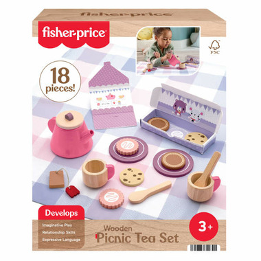 It’s tea time! Preschool kids can plan and share a party for two with this Wooden Picnic Tea Set from Fisher-Price. This 18-piece playset includes a soft fabric blanket, a paper party invitation, and wooden cups, saucers, spoons, teapot with lid, tea bag, and cookie box with 6 pretend treats to share. Made with wood from Forest Stewardship Council-certified sources (FSC-N004566) and decorated with non-toxic, water-based paints, this toy tea set encourages imaginative pretend play, expressive language, and relationship skills. Not intended for use with real food. Colors and decorations may vary.