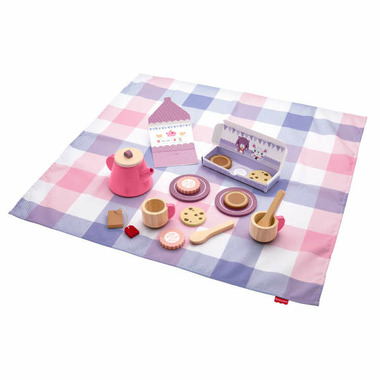 - Stylish toy tea set with wooden play pieces and a soft fabric picnic blanket