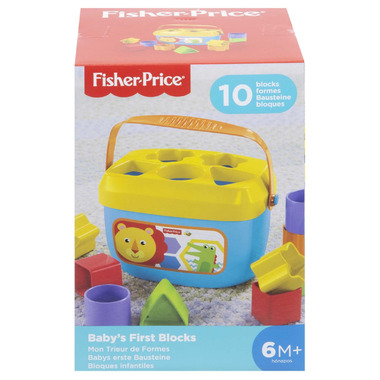 Open a bucket of fun for your baby with the Baby's First Blocks set from Fisher-Price. These chunky, colorful blocks help introduce colors and shapes as babies sort, stack and drop the blocks through the slots in the bucket lid. Empty the bucket to start the fun over again and again! And with an easy-carry handle, you can take Baby's First Blocks wherever you and your tiny tot go! All that block-grasping and shape-sorting play helps strengthen your baby's hand-eye coordination and dexterity while enhancing their problem-solving skills.